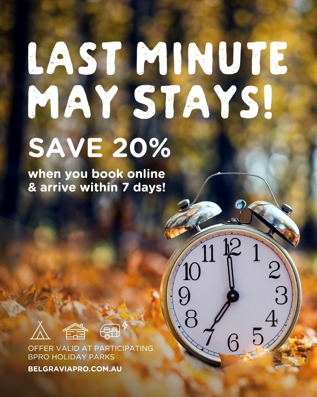Book online and arrive within 7 days at Spicer Caravan Park to enjoy a whopping 20% off your stay!