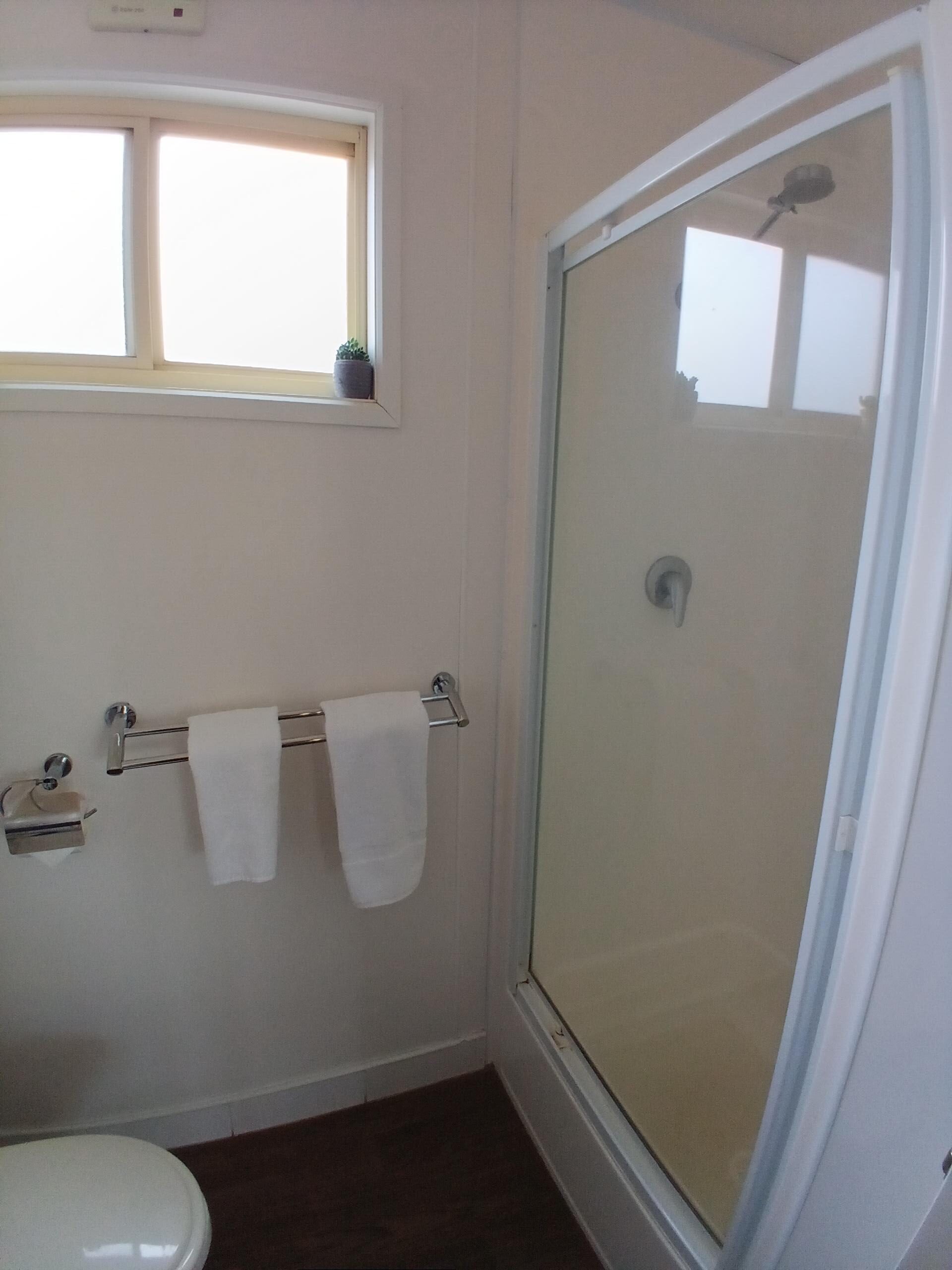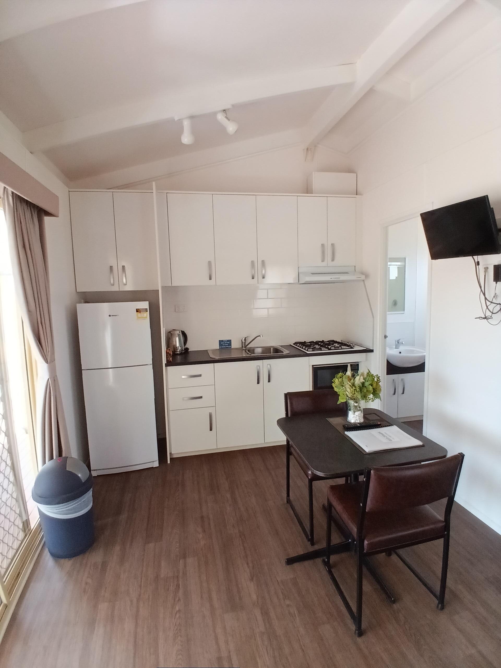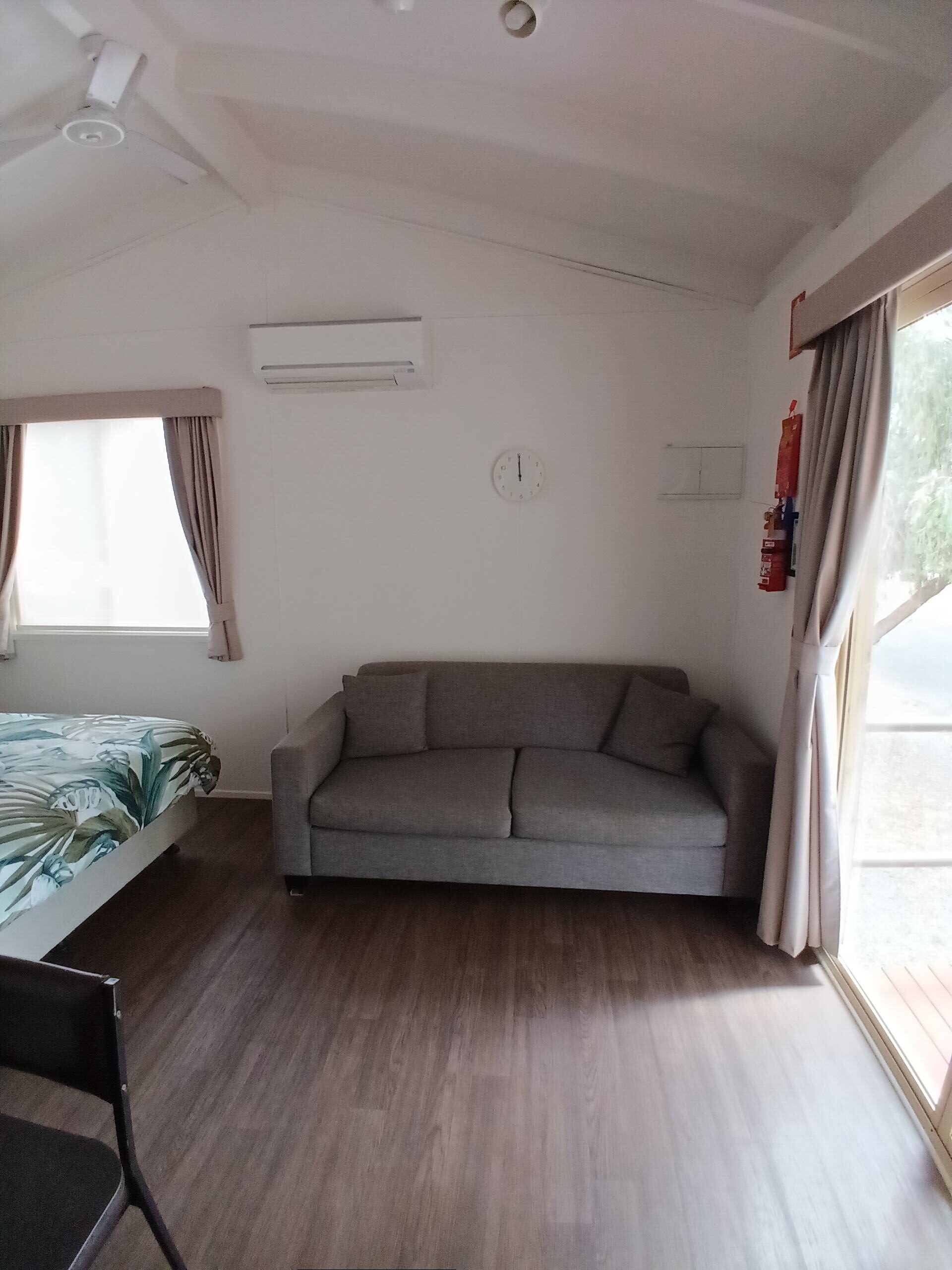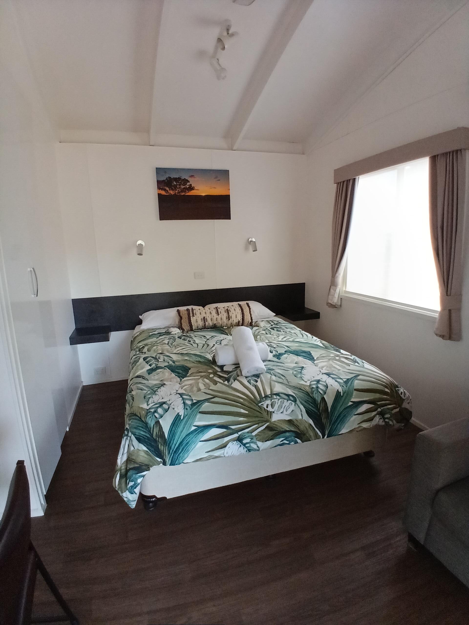A studio deluxe cabin is open plan with a queen bed and double pull-out sofa bed. Sleeps 4.